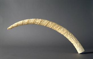 On viewThis ivory tusk, probably dating to the late 19th century, is an example of an important tradition of export art. A tusk this size would take approximately sixteen months to carve. The surface is covered with a lively series of everyday Loango life in relief that spiral the length of the tusk. The scenes are separate vignettes and not meant to be read as a continuous story. Tusks such as this one were nonfunctional and were made for Europeans as prestige souvenirs. European and indigenous people are portrayed alongside animals such as monkeys, fish, and crabs.