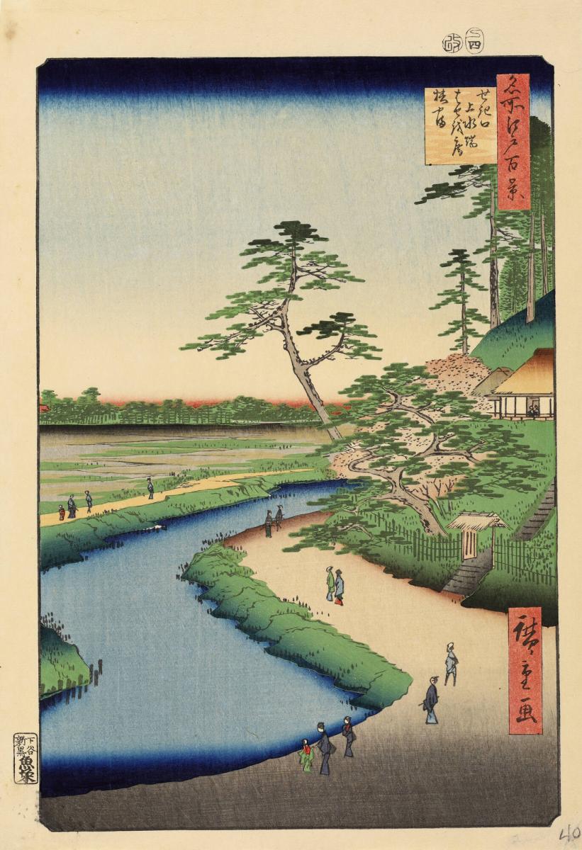 Bashō's Hermitage on Tsubakiyama near the Aqueduct in the Sekiguchi Quarter (Sekiguchi jōsui-bata Bashōan Tsubakiyama), from the series One Hundred Famous Views of Edo (Meisho Edo hyakkei)