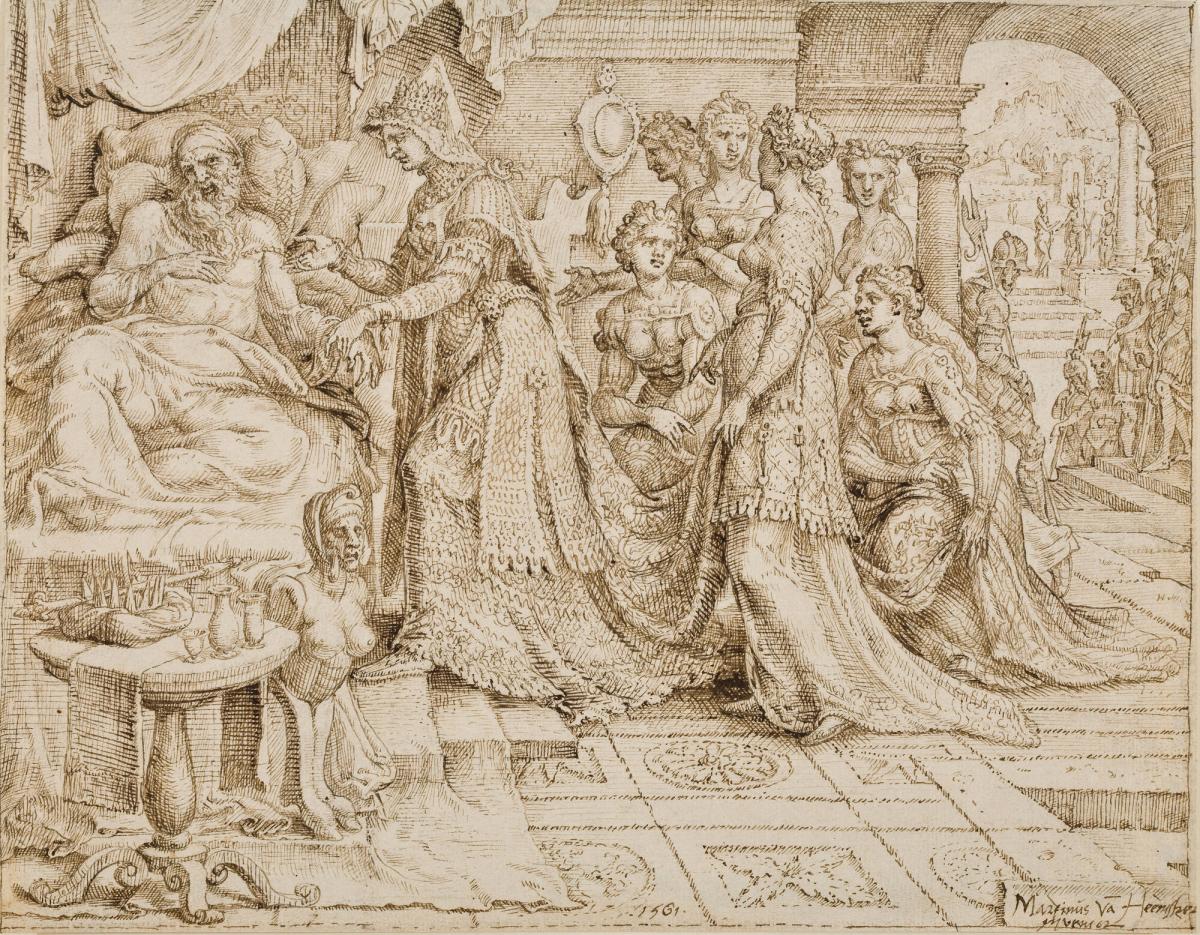 Not on viewThe drawing depicts the scene from I Kings 21:4-7 in which, having been refused the opportunity to purchase a vineyard, Ahab has taken to his bed and is comforted by his wife, Queen Jezebel, who secretly plans to kill Naboth, the vineyard's owner. The drawing is the first in a series of six made in 1561 for a set of prints illustrating the story of Jezebel's treachery. It is a tour-de-force that repays detailed examination, from the king's crown and scepter on the table to the brilliantly shining sun over the distant landscape.