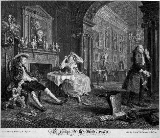 Not on viewBy publishing his own engravings and catering to a mass market, William Hogarth was the first artist to exploit printmaking as an alternative to traditional patronage. His satirical social commentaries embraced the common and irreverent, sparing no class from his biting wit. Marriage A-la-Mode, after a series of paintings from 1743, were the most popular of what Hogarth called his "modern moral subjects" - didactic tales that unfold through six or eight engravings following the vanities, vices, and ultimate self-destruction of their protagonists. Embedded emblematic details and accessories further elucidate the narratives depicted.
