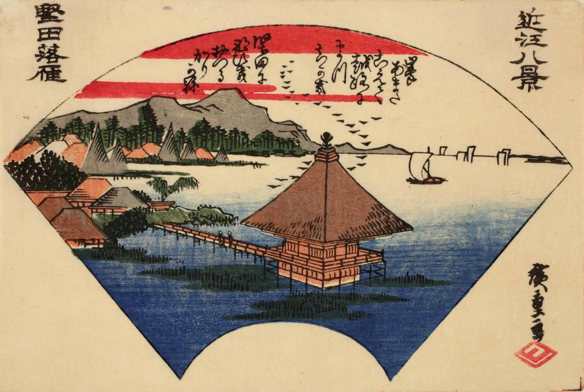 Not on viewThis work is part of a complete set of the Eight Views of Ōmi, by the renowned and prolific landscape print designer Utagawa Hiroshige I. The scenes are enclosed in shapes that imitate folding fans. In China, paintings on fans were often preserved by mounting them in albums.