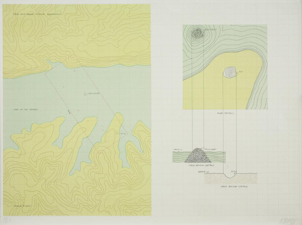 Not on viewMorris's unrealized land art projects for the state of Missouri drew inspiration from "certain phenomena that can best be experienced outside: dust storms, earthquakes, plowed fields, sudden changes of temperature, Indian mounds, concrete dams, formal gardens, steam rising from city streets, natural disasters and aftermath, suburban hedges and gravel paths, burning industrial wastes, storage dumps of vast quantities of material...." Each was conceived on a vast scale, so that the whole of the work could only be experienced through a walking exploration of the landscape. Morris designed each project to relate to a specific terrain, rather than a definite geographic location.