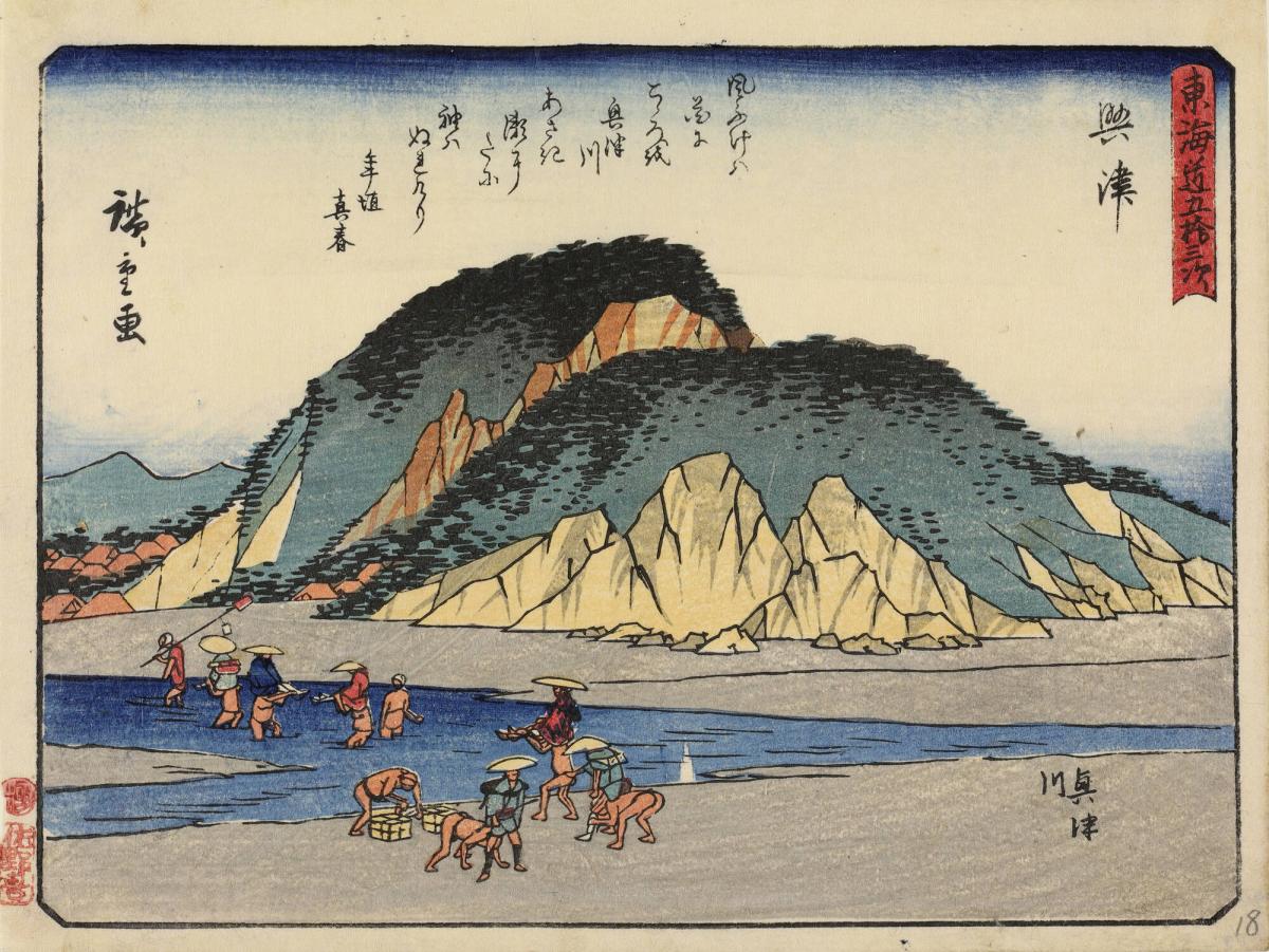 Fording the Okitsu River, with a Poem by Toshigaki Maharu, no. 18 from the series The Fifty-three Stations of the Tōkaidō
