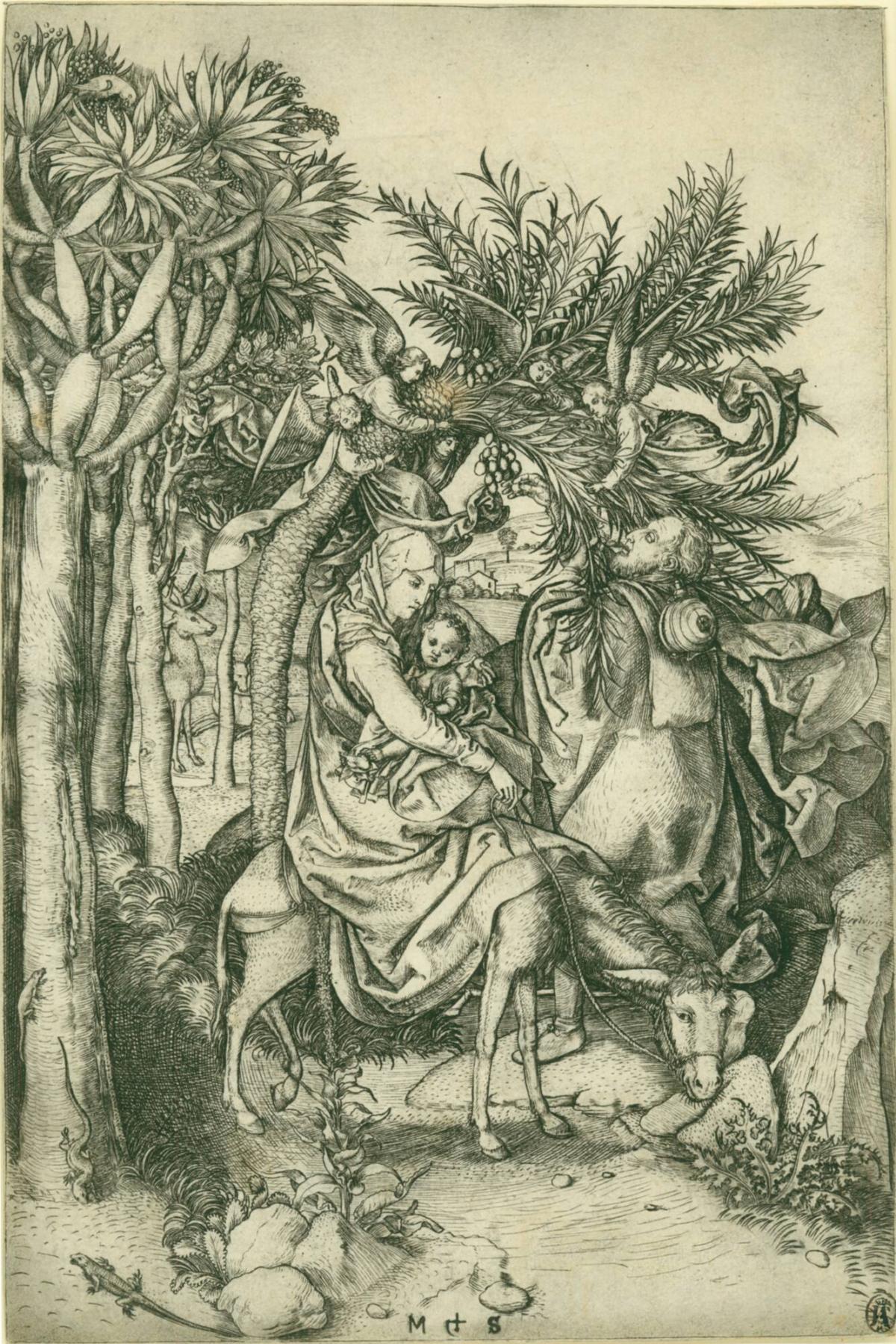 Not on viewThe New Testament narrative of the Holy Family fleeing Jerusalem into Egypt to escape King Herod’s massacre of first-born sons is one that frequently lends itself to depictions of unfamiliar landscapes. In Schongauer’s representation, the Holy Family wanders through a land decidedly different from what the artist would have encountered in his native Germany. His penchant for incorporating a scintillating amount of detail has allowed scholars to identify the tree at left as a specific type—a rare Canarian dragon tree—native to the Iberian peninsula. Whether the artist traveled to the region remains an open question, but his inclusion of the extraordinary specimen in this rendering points to his attempt to provide authentic details for a distant landscape he had never seen.