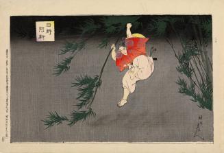 A young warrior grasps a stalk of bamboo, which bends in an arc to slow his fall. This illustrates a moment in the legend of a 14th-century hero, Hino Kumawaka 日野熊若, or Hino Ashin 日野阿新. He was the son of a high counselor to Emperor Go-Daigo (1288–1339) and in some stories is linked romantically with the emperor. When Kumawaka’s father is unjustly accused, exiled, and executed, he vows revenge. After killing the man who executed his father, Hino is pursued by the man’s forces but escapes by swinging over a moat on a long bamboo stalk, seen here. As in the story of Mèng Zōng, seen in a nearby print, Kumawaka’s actions were often linked with the virtue of filial piety, or respect for one’s parents.