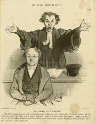 > —Mon client n’est pas un de ces maris présomptueux qui viennent se vanter devant vous d’avoir été trompés par leur femme, sans avoir autre chose que de vagues soupçons... grâce au ciel nous avons des preuves... nous en avons à foison, et c’est le front levé, et sans crainte d’un démenti, que monsieur peut annoncer hautement et en tout lieux... qu’il est... qu’il est ... enfin ce qu’il est ! ...<