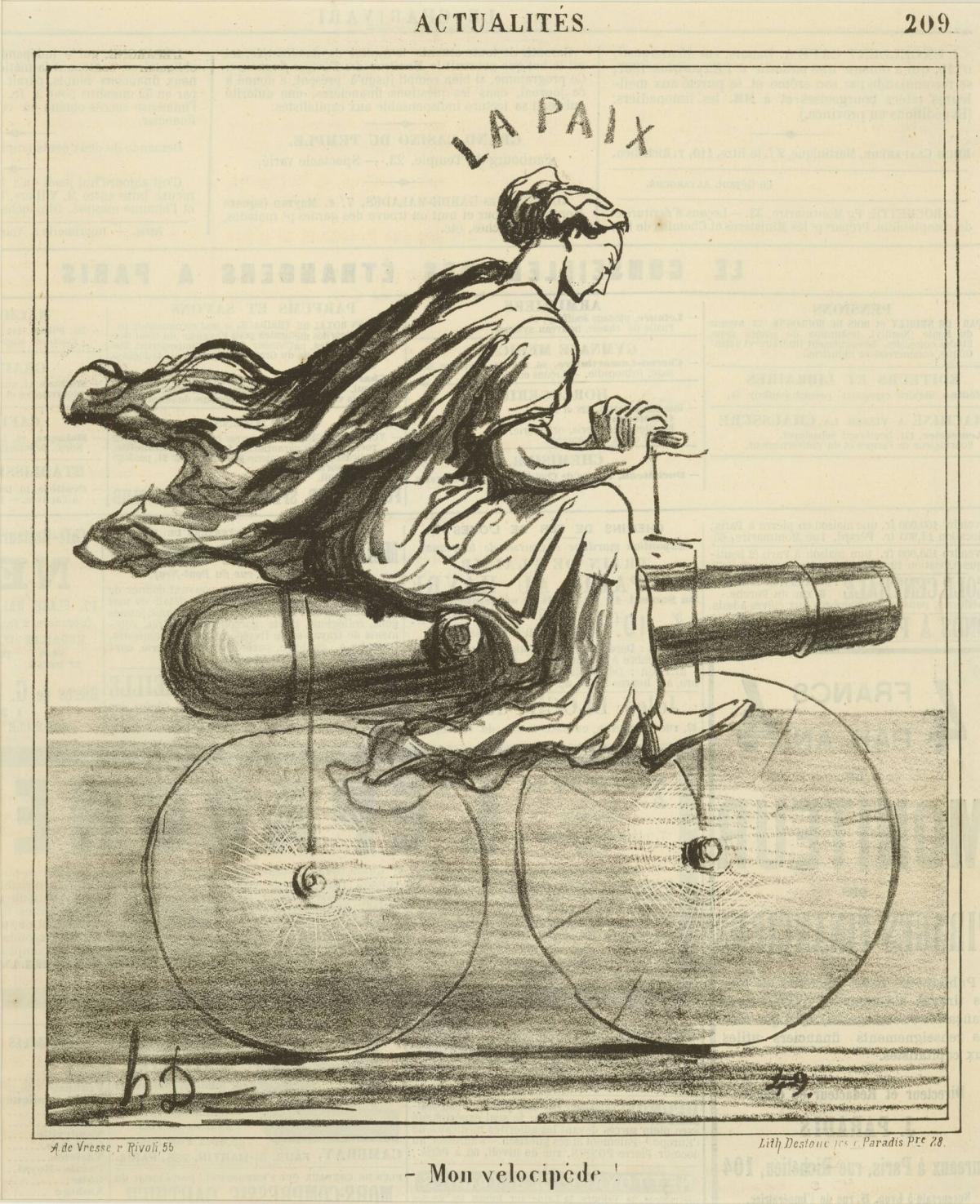 Not on viewA woman representing Peace is riding a bicycle with a cannon strapped to its frame. Daumier expressed in his prints from this time a growing sense of foreboding about Prussian militarism, sounding the alarm about the inevitability of a Franco-Prussian War. Daumier’s fears were well founded. In 1870, Prussia invaded France, setting off a brief but devastating war that would leave France humiliated, amputated of the key border provinces of Alsace and Lorraine, and embroiled in the bloody civil war of the Paris Commune.