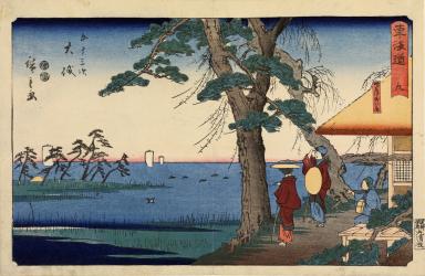The Hut of the Poet Saigyo at the Rising Snipe Marsh at Oiso, no. 9 from the series The Fifty-three Stations of the Tōkaidō, also called the Reisho Tōkaidō