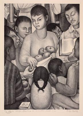 Not on viewThis lithograph reproduces one panel from Rivera's murals in the Ministry of Public Education, painted between 1923 and 1928. The entire mural of 124 frescoes spans 5,000 square feet. It helped earn Rivera international fame and validated the Mexican mural movement for artists outside the country. Above this panel in the painted mural a crimson banner proclaims, "Blessed is the tree that yields ripe fruits, it is worth a lot more than a mountain of pesos." The images in Rivera's murals were inspired by the impressive educational and agrarian reforms undertaken during the Obregón and Calles presidencies (1920 and 1928). Rivera revisited these murals in a lithograph series commissioned by New York's Weyhe Gallery.