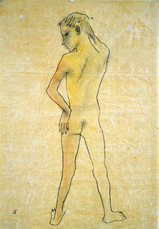 Not on viewAlong with his fellow German Expressionists, Kokoschka was deeply interested in conveying the inner workings of an individual’s spirit and mind through the depiction of his or her physical features. When studying the human figure, Kokoschka preferred to work with prepubescent children, writing that he sought out models that were as thin as possible, especially children who work in circuses “because you can see their joints, sinews and muscles so clearly, and because the effect of each movement is modelled more emphatically with them.” In this image, Kokoschka creates a contour drawing of a young girl whose gangly limbs evoke a sense of dynamism and potential for movement. While the figure assumes a pose that reads as adult, her slim hips and adolescent awkwardness reveal her young age.