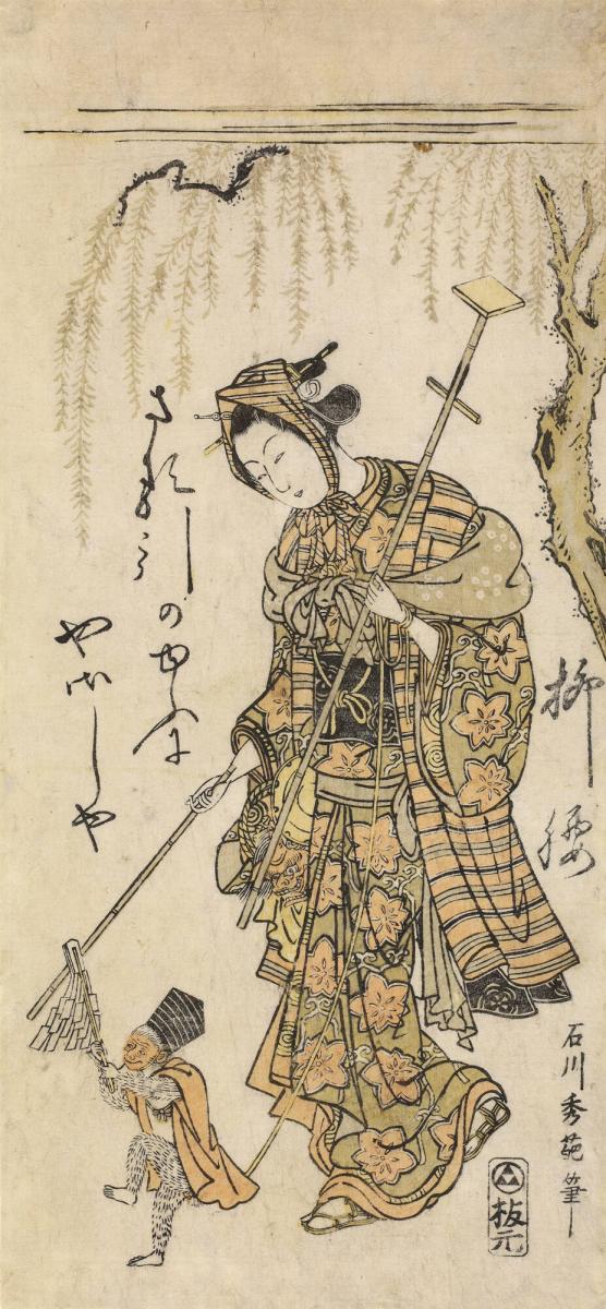 Not on viewIt was widely believed that monkeys possessed the special ability to exorcise the illnesses of horses during the Edo period of Japan (1603–1868). Monkey leaders, or trainers, were commissioned to stage performances in front of horses so they could stay healthy and strong. In this print, the willow in the background symbolizes the arrival of spring, the season when monkey leaders were most active. The willow was believed to have the power to purify the world, here referencing the act of exorcism. The gentle curves and branches of the willow echo the feminine nature of the monkey trainer, as the poem inscribed on the image indicates: “The monkey leader is gentle in the light: a willowy waist.”