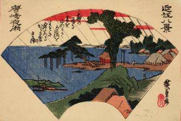 Not on viewThis work is part of a complete set of the Eight Views of Ōmi, by the renowned and prolific landscape print designer Utagawa Hiroshige I. The scenes are enclosed in shapes that imitate folding fans. In China, paintings on fans were often preserved by mounting them in albums.