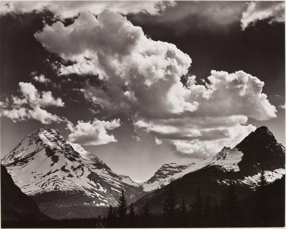 Adams experimented with different cameras and techniques, using papers with a high gloss, employing long exposures with the aperture set at f/64, and pioneering a system that enabled him to capture an impressive range of light values based on a scale of ten zones ranging from black to white. In determining his compositions and exposures, Adams exploited the critical role that can be played by middle tones. Noon Clouds is a spectacular example of Adams's use of his zone system to capture-with remarkable clarity-both near and far details, while also suggesting the transient nature of the cumulus clouds floating above the mountains.