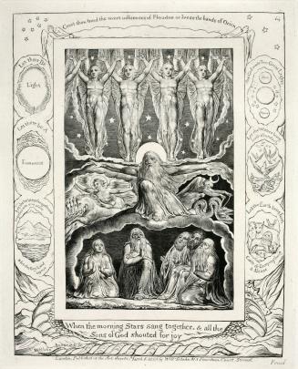 Not on viewPainter, poet and engraver, William Blake was an eccentric visionary and ardent nonconformist known for his mystical themes and innovative forms. His agile and elongated figures, influenced by Gothic sculpture and Michelangelo, are often pictured floating in a non-material world, adorned with symbols from his complex personal mythology. Blake's Book of Job integrates image and design with biblical texts that reconstruct the Old Testament in New Testament terms. The Job narrative, in which Satan tortures the upright Everyman in a test of faith, mirrors Blake's own artistic vision. Blake was deeply opposed to academic art, and in his interpretation of the tale Job is transformed from despair to redemption through a spiritual belief in the power of individual imagination.