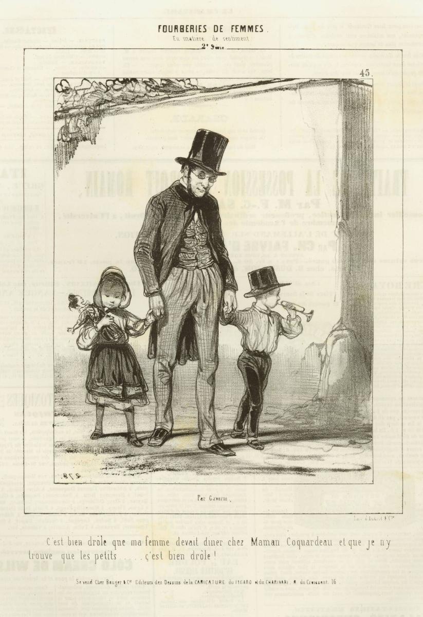 Pleased with the success of the Robert Macaire series, Philipon asked Gavarni to produce a new series on Mrs. Robert Macaire. Instead, the two settled on a series on swindles of the heart. In it, Gavarni develops scenes of trickery, subterfuge, and duplicity that rival those of Balzac’s most memorable spinsters, courtesans, and adulteresses.<