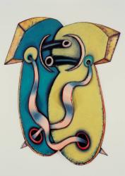 As personal imagery was important to Murray, Switchback may depict a pair of shoes with pink "laces" threaded from one to the other-or it may show a stylized human heart, complete with blood vessels. The real subject of this work, however, is the tension generated between its richly painted, layered surface, and its wooden supports. The vivid blue and yellow hues of the two main forms repeat, switch roles, and are activated with swirling brushwork. In a general sense, titles are important in Murray's work; this particular one suggests a quick movement or sudden change of direction. Cubist artist Juan Gris's shifting viewpoints and fractured forms or painter and printmaker Philip Guston's late works with their cartoon shapes are most often referenced to describe Murray's playful treatment of abstract and representational forms that physically overwhelm the viewer. Murray herself acknowledged that she was "raised on comics and cartoons and loved the way the images jumped off the page."