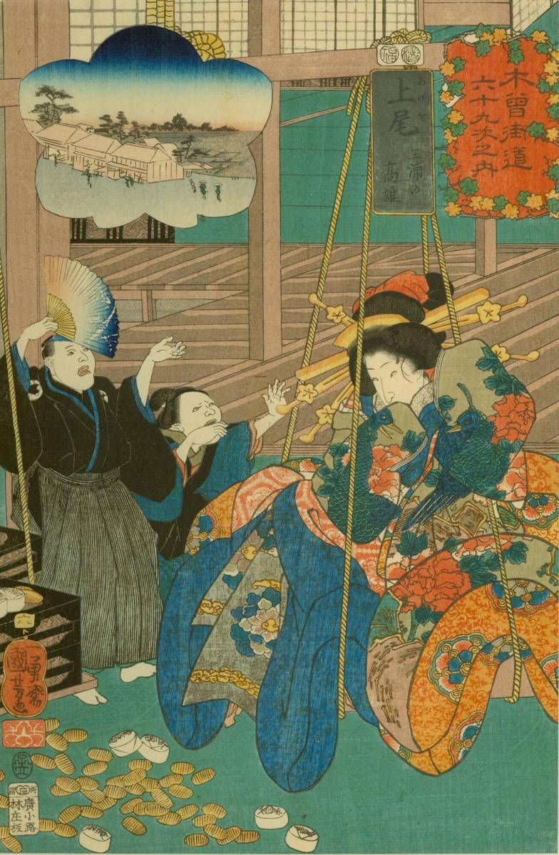 In Japanese, age means “to raise” and o refers to Takao’s name. Thus, the first part of the print’s title is a pun on both the name of the stop and the action of raising Takao’s worth on the scale.