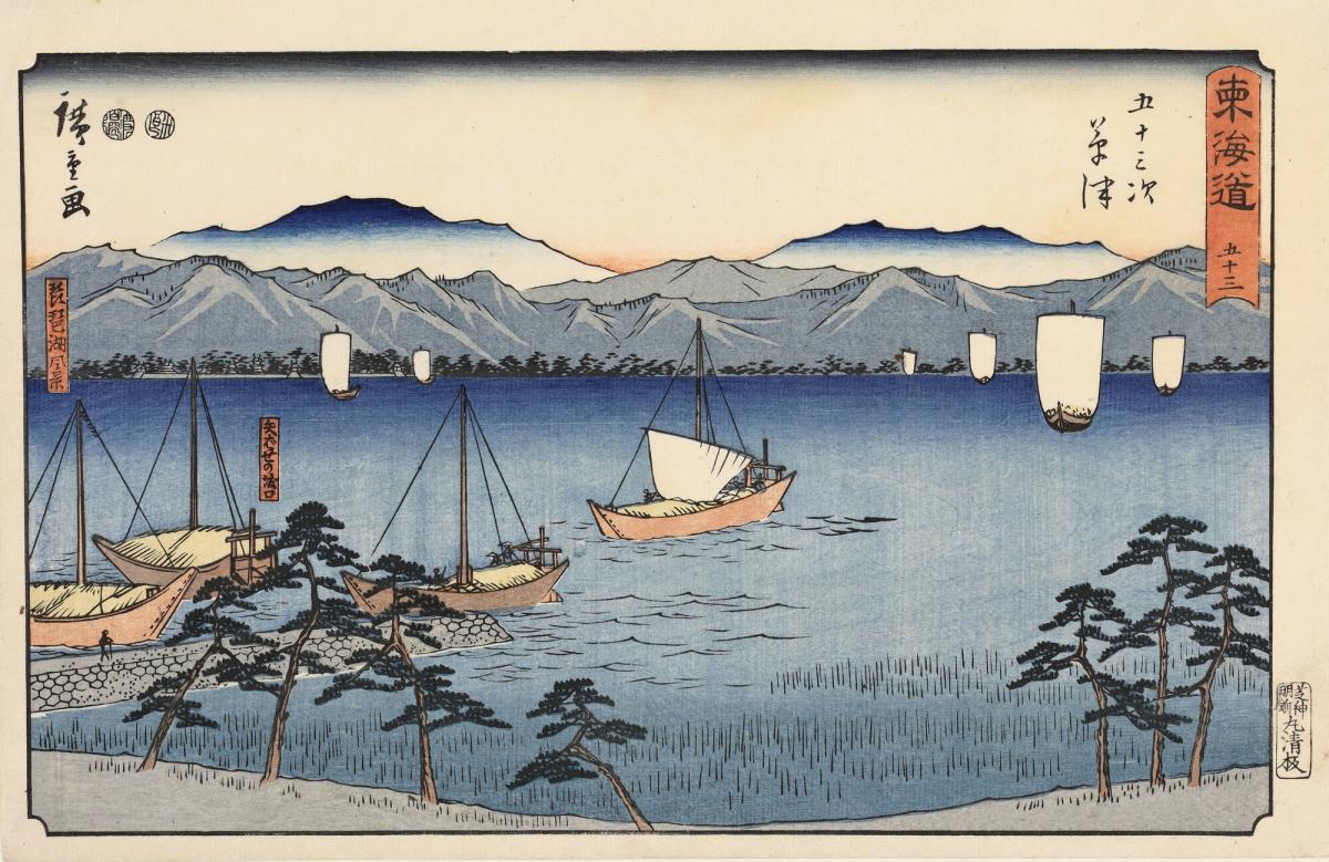 View of Lake Biwa from the Landing of the Yabase Ferry, no. 53 from the series The Fifty-three Stations of the Tōkaidō, also called the Reisho Tōkaidō