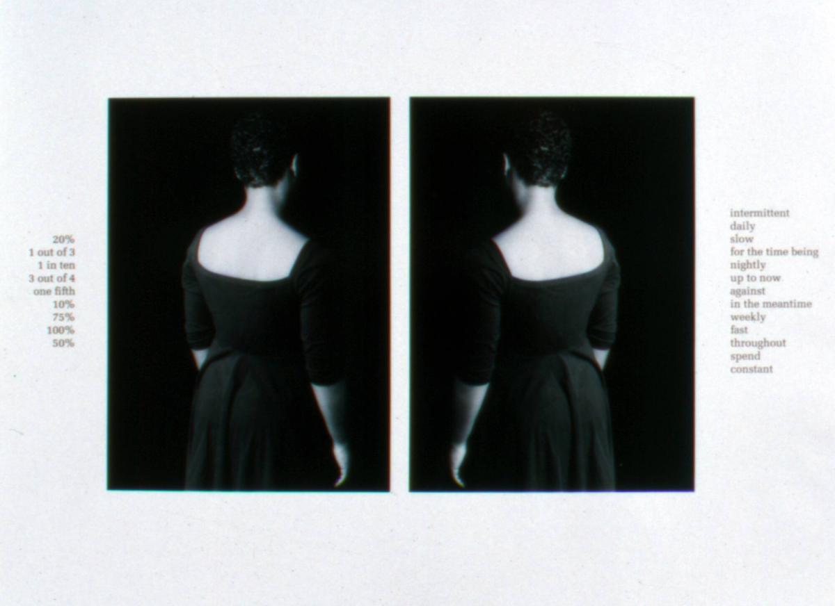 Not on viewPartitions & Time belongs to a portfolio of twelve images that was made as part of a fundraising campaign against the HIV/AIDS epidemic. In Partitions & Time, Lorna Simpson disrupts the clarity of subject that a photograph presumably affords by blurring her image. She also denies the viewer access to her subject by portraying the back of an unidentified female sitter. Through the techniques of obscuring and doubling her subject, Simpson creates an optical conundrum, challenging the observer to ponder her artistic choices. Partitions & Time asks spectators to become active participants in the making of the work’s meaning by contemplating the relationship between the sitter and the accompanying text, which refers to American quota systems and federal policies regarding minority groups. The presence of text alongside a black-and-white photograph endows the work with a documentary character, encouraging the viewer to contemplate the identity of the subject in relation to the categorical and quantifiable terms in the margins.
