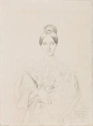This elegant portrait is of the former Elise Dosne (1818-1880), the fifteen-year-old bride of Louis-Adolphe Thiers (1797- 1877). Distressed by the unfavorable public reception of his painting The Martyrdom of Saint Symphorian during its exhibition at the 1834 Salon, Ingres sought to leave Paris. When Thiers, recently named Minister of the Interior of France, announced a search for a replacement for the director of the French Academy in Rome, Ingres immediately sought the post and was appointed in early July of 1834. It is not clear whether Ingres's portrait of Madame Thiers was drawn in supplication or in gratitude for the position, but it was certainly done between April 1834, when Thiers was named Minister, and December of that year, when Ingres left for Rome. Madame Thiers's mother was assumed by contemporaries to have been Thiers's mistress, and it is known from numerous accounts that the union between Elise and the much older Thiers was no marriage of love; those who knew her described Elise as silent and sullen. The sheen of her smooth hair is here marvelously rendered, as befits her beauty, but the blank look of her eyes tends to support the contemporary reports of her demeanor.