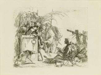 Not on viewAlthough Tiepolo—a major international artistic figure in 18th-century Europe—provided designs for prints throughout his career, he did not take up the etching needle himself until around 1740. Etching provided greater freedom for the realization of his witty imaginings than did formal commissions, and the print medium allowed for wide dissemination of his output. The ten prints in the >i>Capricci series follow no obvious theme and their collective meaning remains imprecise. Figures gather in unspecified locations and engage in vague activities, often with supernatural entities, as in the case of Death shown here. While this image of confrontation between the living and the dead may be understood as a reminder of the brevity of life, Tiepolo’s highly individual rendition of the subject includes humorous details, such as the scrawny dog raising his hackles at the sight of Death.