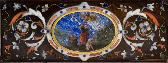 Ligozzi painted the scene of Christ on the Mount of Olives (Agony in the Garden) on copper as the centerpiece of this elaborate portable altar, as well as the tiny Sacrifice of Isaac below, on costly and precious lapis lazuli. He is also very likely responsible for the design of the overall altarpiece and its case, which would have been made along with the assistance of specialists working in pietre dure, from a Medici Grand Ducal workshop set up for that purpose in the sixteenth century. The altar, created from wood stained to look like ebony, also includes two gilt bronze columns inlaid with lapis lazuli and inlays of mother-of-pearl, agate, lapis, and semiprecious stones, as well as silver putti with gilded wings.
