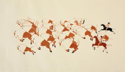 Not on viewGuerue was a student of Dorothy Dunn at the Santa Fe Indian School, as well as a Northern Plains scholar. His work follows the flat, two-dimensional, traditional Plains style. Like many Native American artists of North and South Dakota, Guerue depicts everyday activities from tribal times, including camp and village scenes, buffalo hunts, moving camp, butchering buffalo, tanning hides, and warfare.
