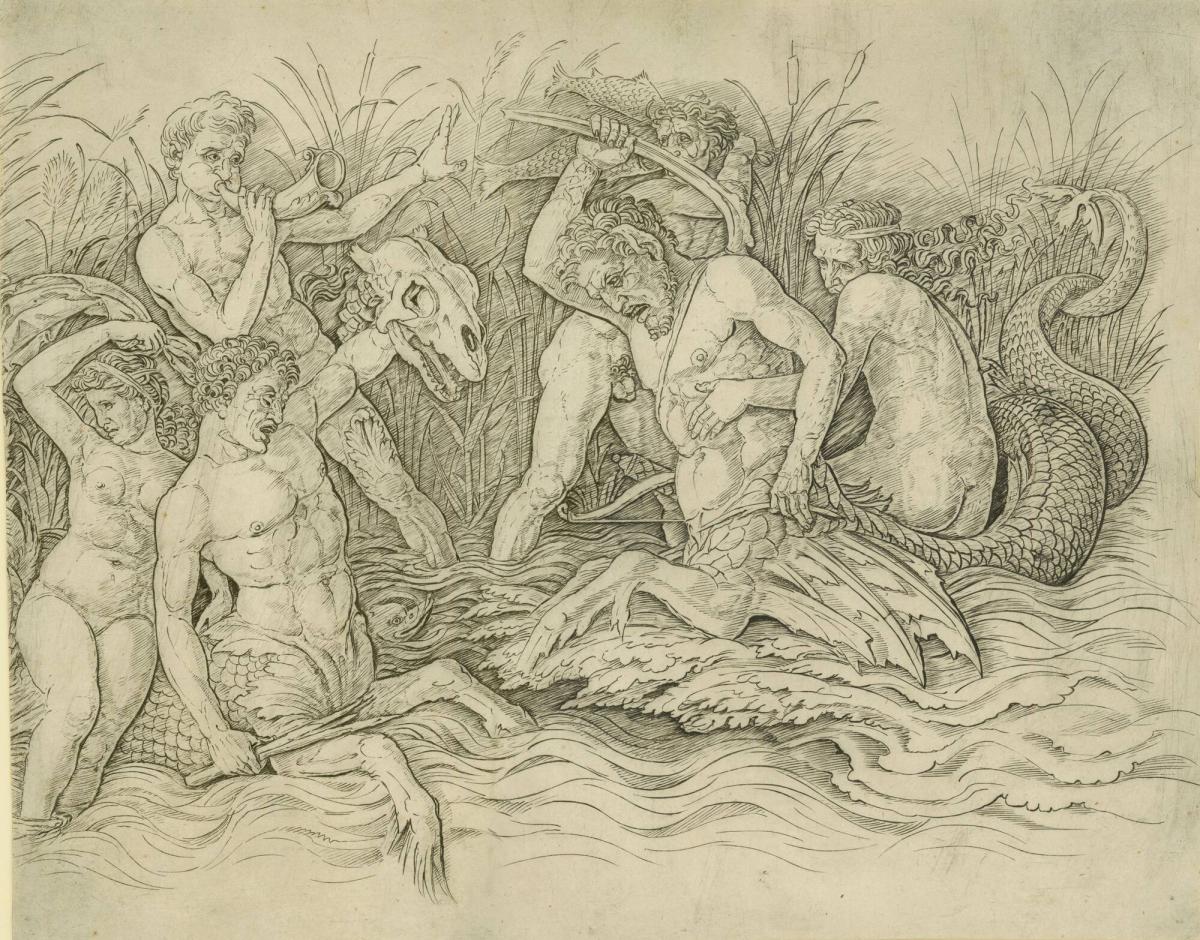 Not on viewOne of the most significant Italian engravers of the 15th century, Mantegna frequently found inspiration in ancient sources for his compositions and transformed them into images of inventive originality. The shallow field of this half of a battle scene between mythical sea gods and beasts recalls carved reliefs from ancient Roman sarcophagi. But the artist’s attention to anatomical definition and the depth suggested by the carefully incised shading and foreshortening imbue the figures with a vital force behind their aggressive postures. Some view this print as a depiction of artistic envy; the emaciated woman on the left holds a tablet that reads “invid,” the Latin root for “envy.” The gods depicted belong to the Telchines race, a group of sea-living gods who were master metalworkers. They were responsible for the creation of several important metal objects in Greek mythology, including Poseidon’s trident.