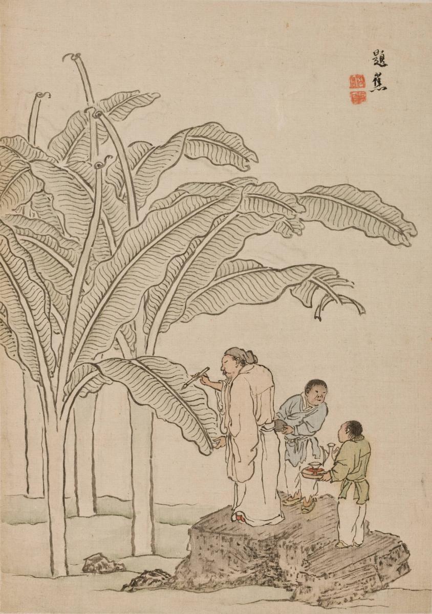 There are many tales from imperial China of scholars so urgent to record their spontaneous verse that they jot it on the nearest surface, often a trunk of bamboo, a stone, or a banana leaf. Writing on banana leaves was also associated with diligence and frugality: the famous calligraphy master Huáisù 懷素 (737–799) was so poor as a boy that he couldn’t afford paper, and used banana leaves to practice writing.