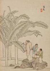A scholar stands on a garden rock, writing on the large leaf of a banana tree. Two smaller servants stand at the ready: one, in blue, holds the man’s ink stone and looks down at the other, who carries a tray with a pitcher of wine and a cup on a lacquered stand.