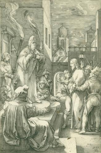 Not on viewDepicted here is one of twelve engravings that comprise the passion cycle executed by Hendrick Goltzius, dedicated to Cardinal Federigo Borromeo (1564-1631).  Somewhat paradoxically, it was Goltzius' adeptness at replicating the styles of other artists that set him apart from his peers.  According to the account provided in Karel van Mander's Schilder-Boeck of 1604, Goltzius became interested in imitating the styles of the old masters and of his contemporaries after visiting Italy in 1590. In this series, each print masterfully emulates the delicate crosshatching and softness of line that Dutch artist Lucas van Leyden (1494-1533) used in his engravings of 1512-20. As van Mander noted, Goltizus' compositions diverge from those of Lucas van Leyden, as Goltizus incorporates compositional elements taken from Albrecht Dürer's (1471-1528) passion cycles, as well as elements of the artist's own invention.