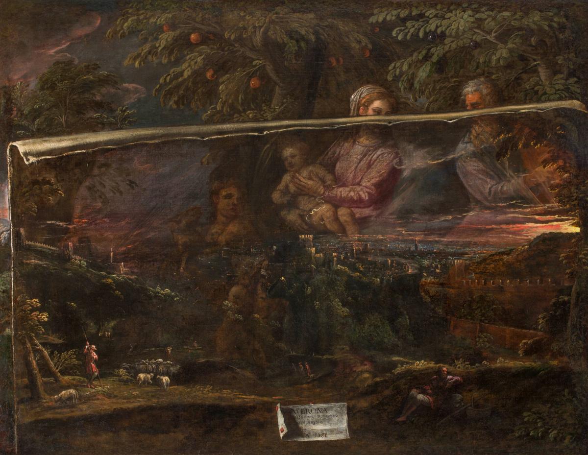On viewThis canvas was painted as a trompe l'oeil (to trick the eye) featuring a scene of the Holy Family, which is simultaneously covered by, and revealed through an illusionistic peeling canvas. The other picture we see is an evening view of Verona, complete with shepherds and a resting traveler in the foreground. Adding to the trompe l'oeil effect is the painted cartellino in the bottom center of the composition, which gives the date of the work, and identifies the landscape as a view of Verona.