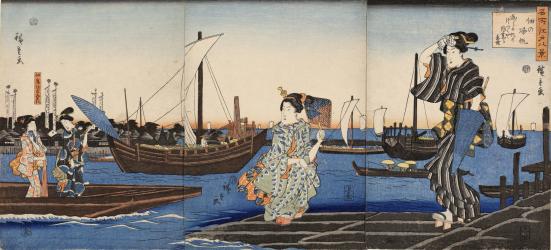 The real subject, though, is in the foreground: four young women, their dress identifying them as members of the urban townspeople (chōnin 町人) class of merchants and artisans. The prominence of the Sumiyoshi Shrine behind them suggests that they are returning from a visit there. Two are already on the shore, two more are on a ferry, about to arrive. Mitate is often subtle. Perhaps the “returning sails” theme refers not only to the ships in the background, but to the women themselves?