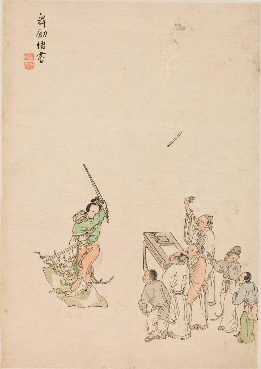 A woman dances with two swords while a group of scholars watches. One, standing behind a table as if about to write on a scroll, has flung his brush into the air in amazement. The painting illustrates a story about the calligrapher Zhāng Xù 張旭 (act. 8th century), who was renowned for a particularly expressive form of writing known as “wild cursive.” Zhāng Xù once saw the famous sword dance of the Lady Gōngsūn 公孫大娘 and—inspired by her graceful and powerful movements—brought his calligraphy to greater artistic heights.