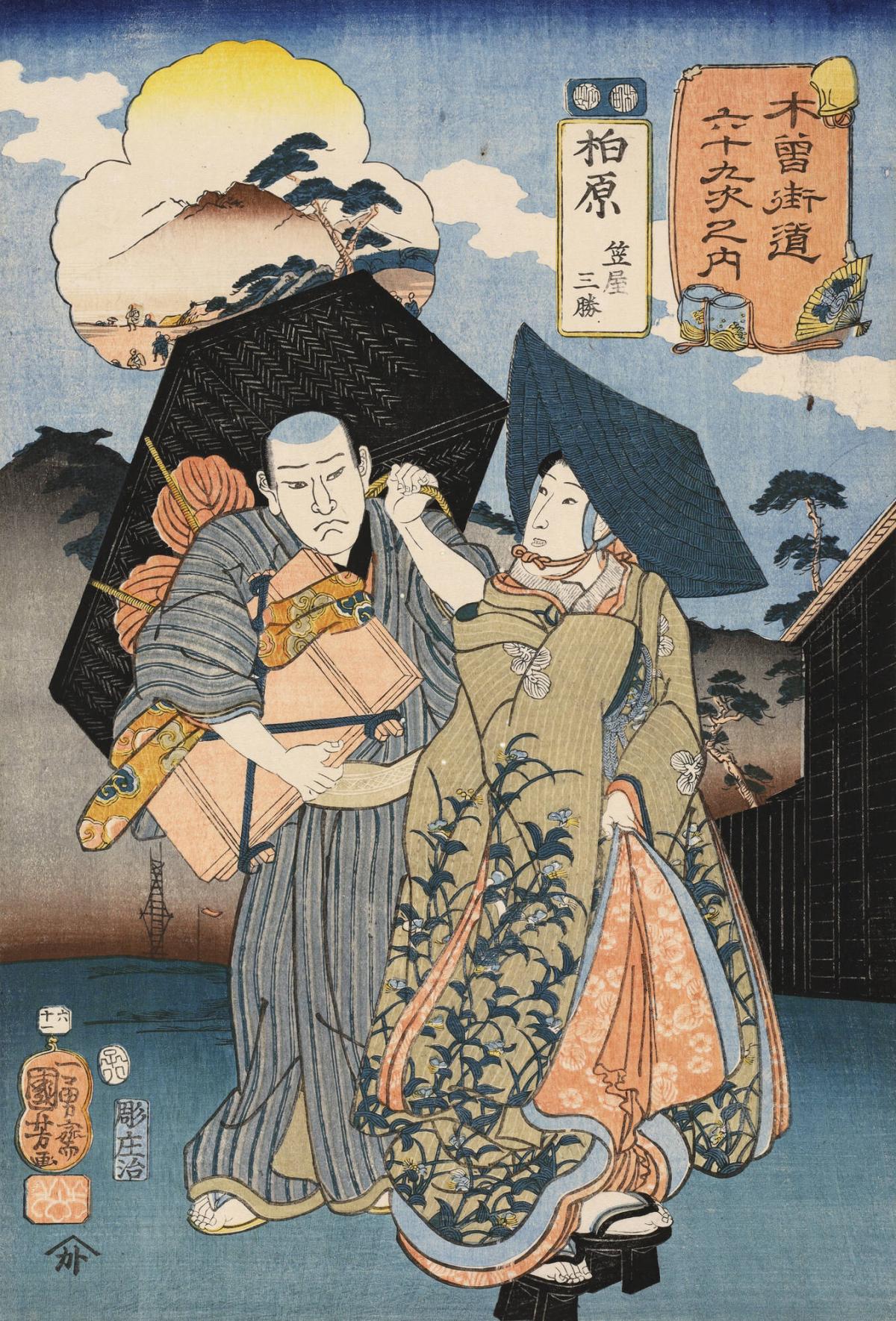 Kashiwabara: Sankatsu of the Kasaya House with a Porter Carrying Her Luggage, no. 61 from the series The Sixty-nine Stations of the Kisokaidō
