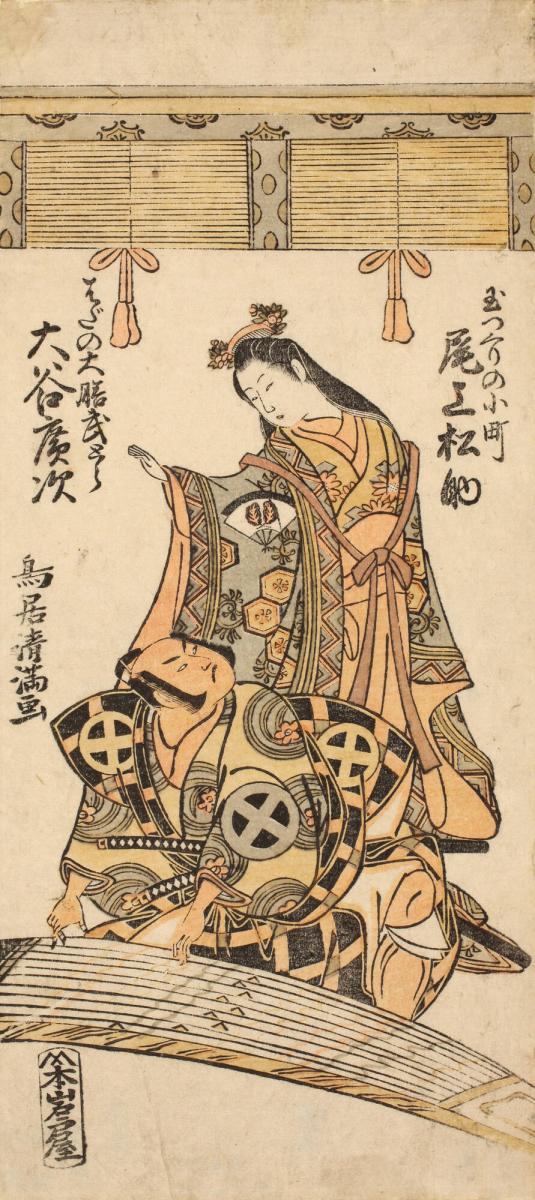 Research has uncovered that this work refers to the play Kisoeuta sakae Komachi performed during the eleventh month of 1762. The figure playing the koto is the kabuki actor Ōtani Hiroji III (1746–1802) in the role of Hada no Taketora. The female character, played by Onoe Matsusuke (1744–1815), is Tamatsukuri no Komachi.
