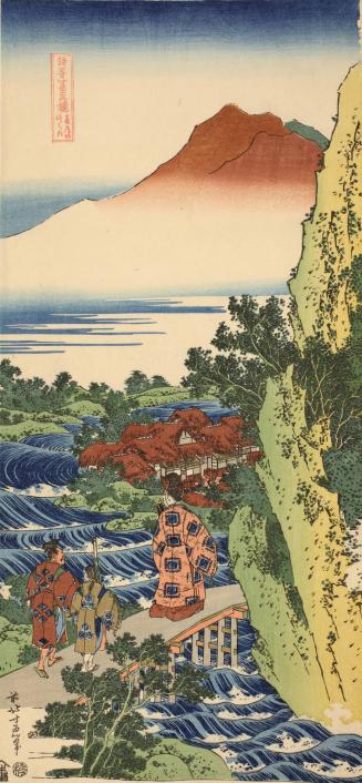 An aristocrat, accompanied by two attendants, pauses on a bridge, gazing at the flowing water below. The inscription above identifies him as the Heian period poet Harumichi no Tsuraki 春道列樹 (?–920). The print illustrates a poem that appears in the well-known imperial anthology Kokin Wakashū 古今和歌集, or Collection of Japanese Poems of Ancient and Modern Times. The text, a meditation on the passage of time, reads: