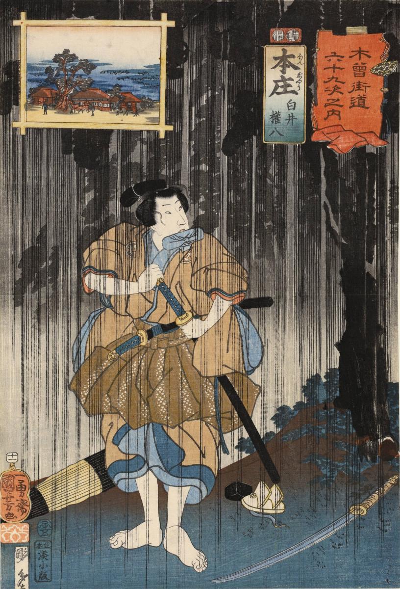 Honjo: The Outlaw Shirai Gompachi Standing in the Rain, no. 11 from the series The Sixty-nine Stations of the Kisokaidō