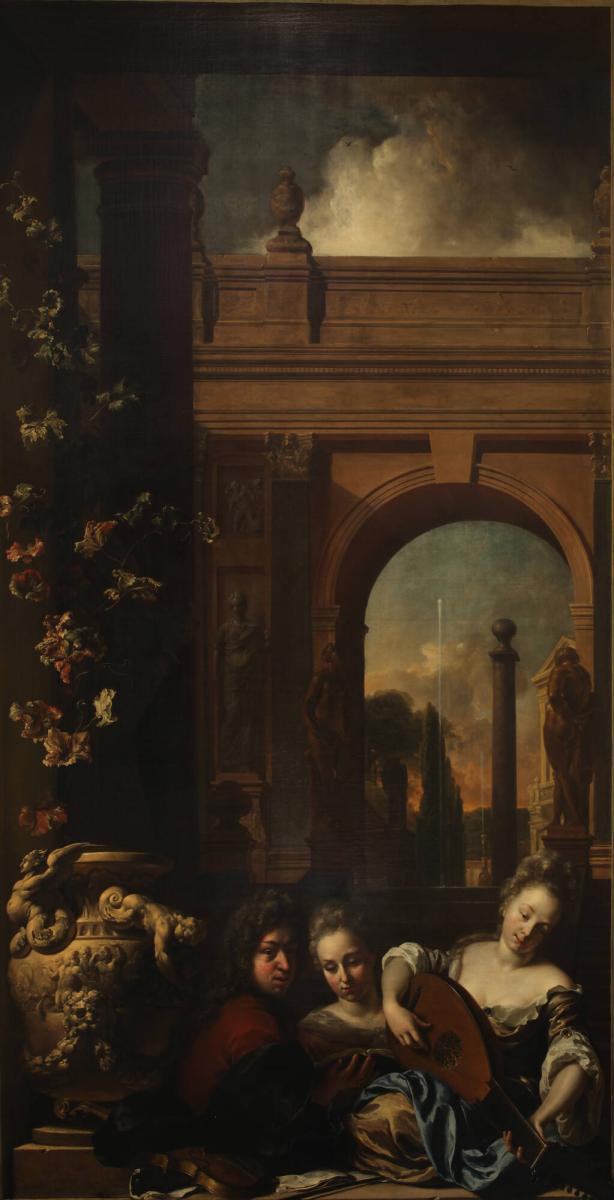 Once part of a set of five paintings by Weenix illustrating the five senses, this monumental canvas is an allegory of “hearing.” The nearly life-size musical trio—a lutist, violinist, and vocalist—is shown mid-performance. The violinist, however, has abandoned his instrument and turns his attention toward the viewer as if we have interrupted this intimate concert. In the background, the classicizing architecture blurs the boundaries between real and fictive space, a technique called quadrature (illusionistic perspectival rendering of architectural elements).