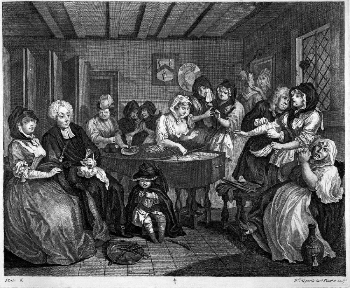 Not on viewThe final plate of The Harlot’s Progress represents Moll’s funeral. Most of the “mourners” are fellow prostitutes and do not appear to heed the cautionary lesson of Moll’s short life. In the background, one woman is preoccupied by admiring her own reflection in the mirror, while some prostitutes in the foreground have taken the opportunity to ply their trade. On the left a preacher, staring into space—while spilling his drink into his lap—delves beneath the skirt of the woman next to him.