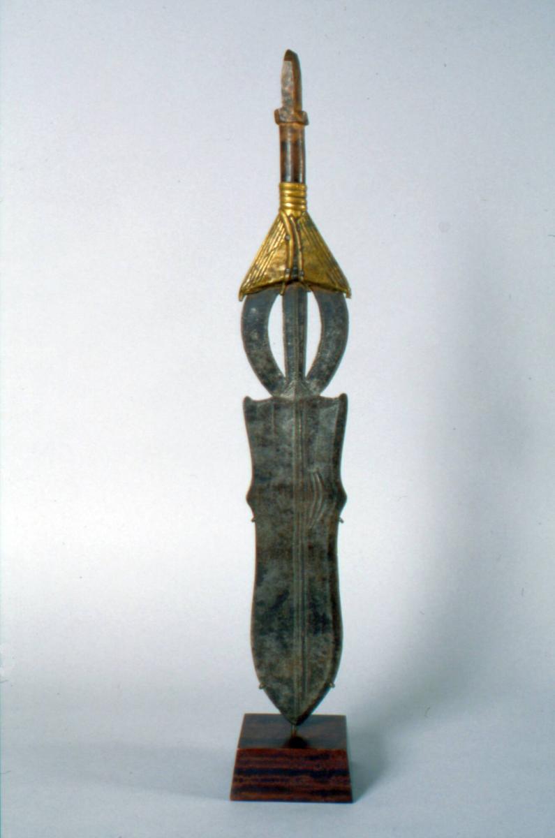 Not on viewMen carried knives like this one during public ceremonies as a way of conveying the power and status of themselves and their family. This style of knife was originally made by Ngombe ironsmiths, who hold social roles of responsibility and prestige akin to warrior leaders, chiefs, and judges within their villages. Ironsmiths from neighboring peoples, such as the Poto, also produced knives in this style, reflecting the circulation of metalworking techniques among nearby artists and communities in a fluid, back-and-forth dialogue. Originally, a small pouch made of animal skin was tied to the base of this knife’s handle. This bag contained empowering substances known only to the pouch-maker.