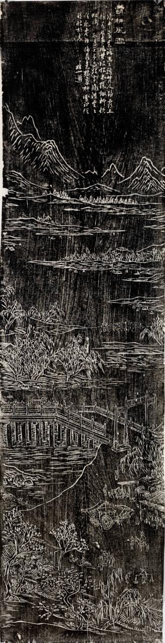 The Eight Views of Guānzhōng were depicted in various mediums including painting, poetry, and calligraphy. Artists emphasized both the natural beauty and cultural significance of each location, often incorporating seasonal and temporal elements. The theme remained popular through the Ming and Qing dynasties, influencing later artistic traditions and serving as an important documentation of Guānzhōng's historical landscape. These examples are ink rubbings based on paintings by the 19th-century artist Wǔ Tíngguì.