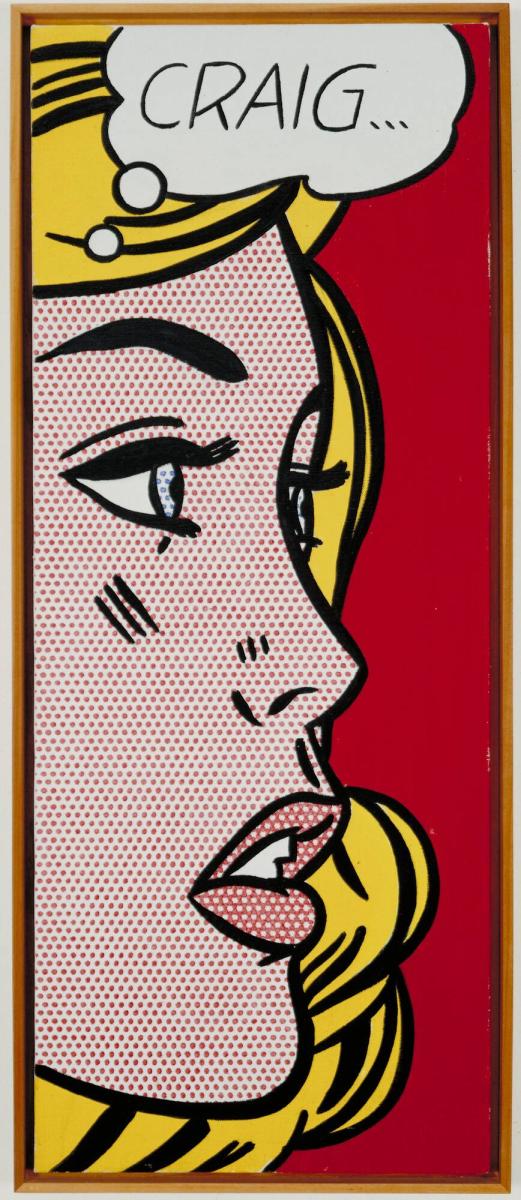 From 1963 to 1965, Lichtenstein worked on "Girls," a series of paintings based on comic book images of attractive young women. The AMAM painting Craig represents a single frame with a pretty blonde shown with her eyes wide and mouth partially open. Lichtenstein's choice of a narrow vertical canvas emphasizes the close-up of her face.
