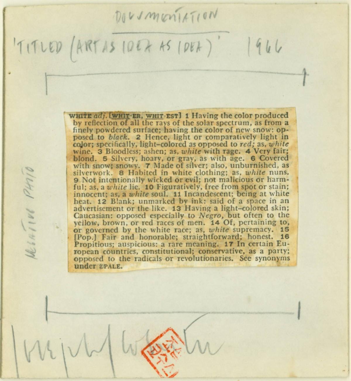 BiographyJoseph Kosuth studied at the Toledo Museum School of Design from 1955 to 1962, and simultaneously began to pursue his interest in philosophy and science. He graduated from the Cleveland Institute of Art in 1964, and in 1965 produced his first language-based works, presenting his ideas in glass, and in assemblages of objects, photographs and dictionary definitions (such as one and five clocks, 1965; London, The Tate Gallery). In 1966 he began the Art as Idea as Idea series, and was already (at twenty-one) writing about and discussing Conceptual Art in various public fora. In the late 1960s he became the American editor of the mostly British Art/Language, an important publication about (and of) language-based conceptual art. During this period he also founded the Museum of Normal Art, an early exhibition space for conceptual art in New York. By 1969 he was no longer producing objects of any kind, but was placing thesaurus excerpts on billboards and in the advertising section of magazines. Until the early 1980s he continued to insert anonymous messages and phrases into a variety of public spaces, the most important of which are the Text/Context billboards of 1978-79. In the early '80s his work returned to the art context of the gallery space, creating works such as the Cathexis series, which juxtapose reproductions of historic paintings with texts.