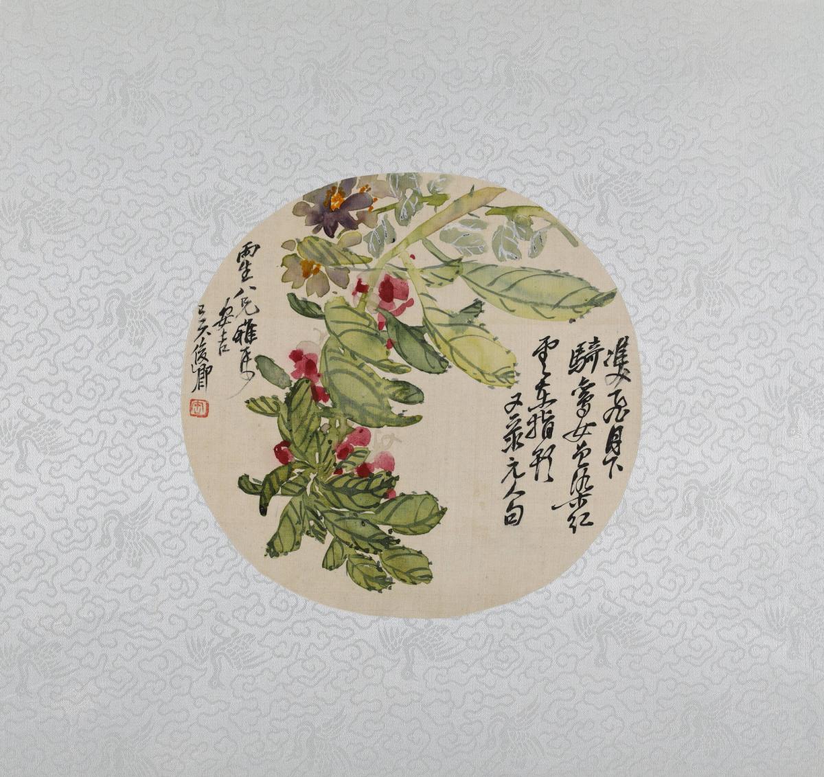 After settling down in Suzhou with his family in 1882, Wu took a trip to Tianjin in 1883 via Shanghai where he made friends with Rèn Bónián 任伯年 (1840—1896) who was a renowned painter of Shanghai School at the time and later played the role of Wu’s advisor when Wu started to paint. Fascinated by the rubbings of Qin stone-drum inscriptions that he received from Pān Zhōngruì潘鐘瑞 in 1886, Wu began to practice the stone-drum script since then and made a lifelong devotion to the study of the stone-drum script. In 1900, 河井荃廬 (1871—1945) became a student of him. Wu was recommended to be the first president of Xiling Yinshe (Xiling Seal Art Society) 西泠印社 in 1913 and in the same year, established an intimate friendship with Wáng Zhèn 王震 (1867—1938) who helped spread Wu’s painting, calligraphy and seal art works among the business circle of Shanghai. At the age of 71, Wu held his first one-person exhibition at a Japanese garden in Shanghai, after which his works became popular among Japanese art circle. Known for his distinctive brushstrokes that imitate the seal scripts, Wu’s paintings, just like his calligraphy and seal works, contain the vigor and strength that distinguish themselves from paintings by other masters of Shanghai School. In addition to his highly individualized brushstroke techniques, the compositions of his flower paintings as well as his uses of bold colors were also breakthroughs from the conventions of traditional Chinese paintings.