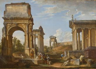 During the 1720s Panini painted several decorative fresco cycles in Roman palazzi and villas. In the last thirty years of his life, the artist specialized in painting the Roman views for which he is best known: minutely detailed architectural fantasies enlivened with freely drawn figures, sometimes depicting religious and historical subjects or contemporary events. To meet the demand for his pictures, Panini oversaw a thriving workshop which included his son Francesco (b. 1738) and the transplanted Frenchman Hubert Robert (1733-1808). His influence can be felt in the works of Giovanni Battista Piranesi and Giovanni Antonio Canaletto. Panini married Catherine Gosset, sister-in-law of the painter Nicolas Vleughels (1668-1737), in 1724. He died in Rome on 21 October 1765.