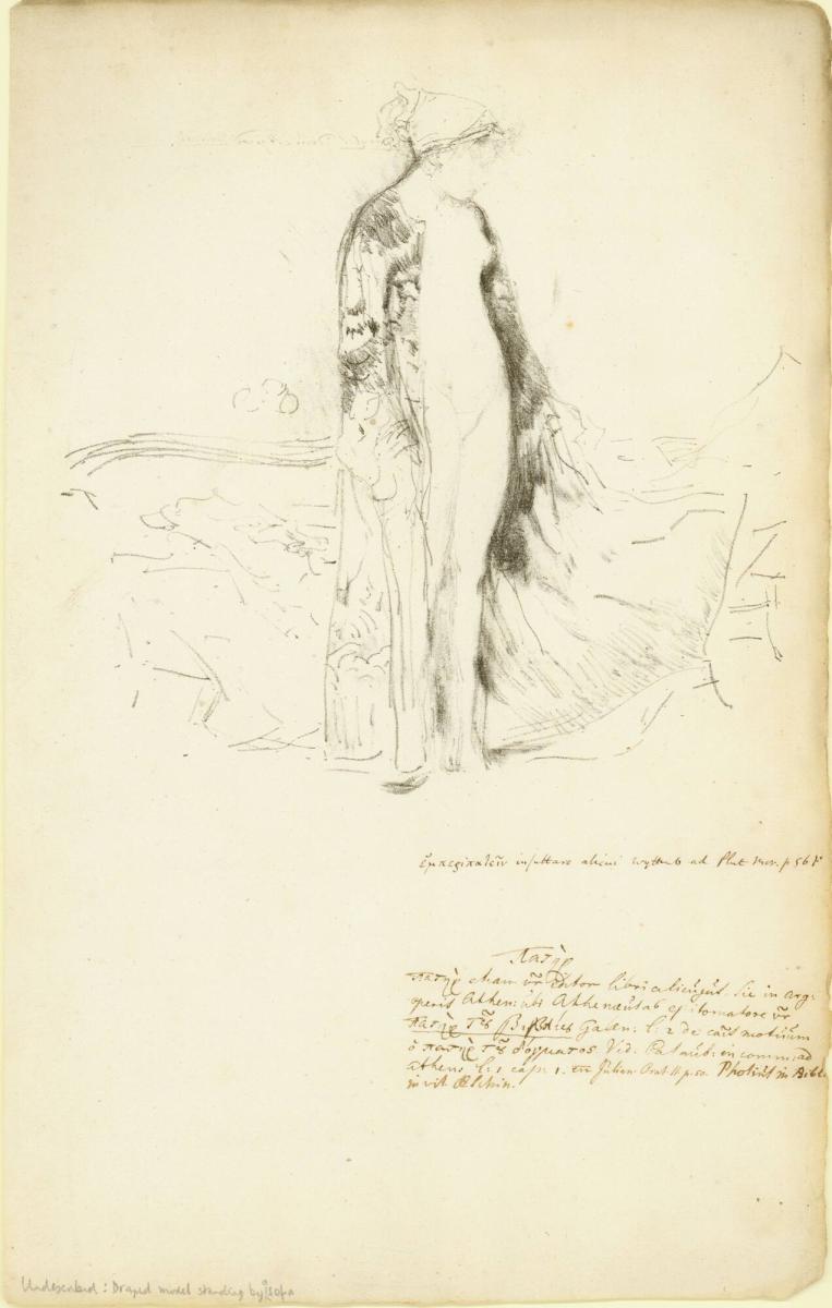 In 1855 Whistler went to Paris, where he studied at the Ecole Impériale Spéciale de Dessin, entered the studio of Charles Gleyre (1808-1874) in 1856, and copied paintings in the Louvre and Luxembourg museums. Forming many friendships with modern painters in both Paris and London, where he moved in 1859, Whistler's painting style was influenced by the realist work of Courbet and Manet, and the narrative painting of the Pre-Raphaelites, as well as the paintings of Vélasquez, Japanese decorative art and woodblock prints, and current optical theories. Whistler's paintings--small seascapes, landscapes, cityscapes, interiors, and mostly large-scale portraits--distill these varied influences into Nocturnes and Arrangements, luminous works whose subject lies primarily in the harmonious relationships of tone and color, rather than realistic description.