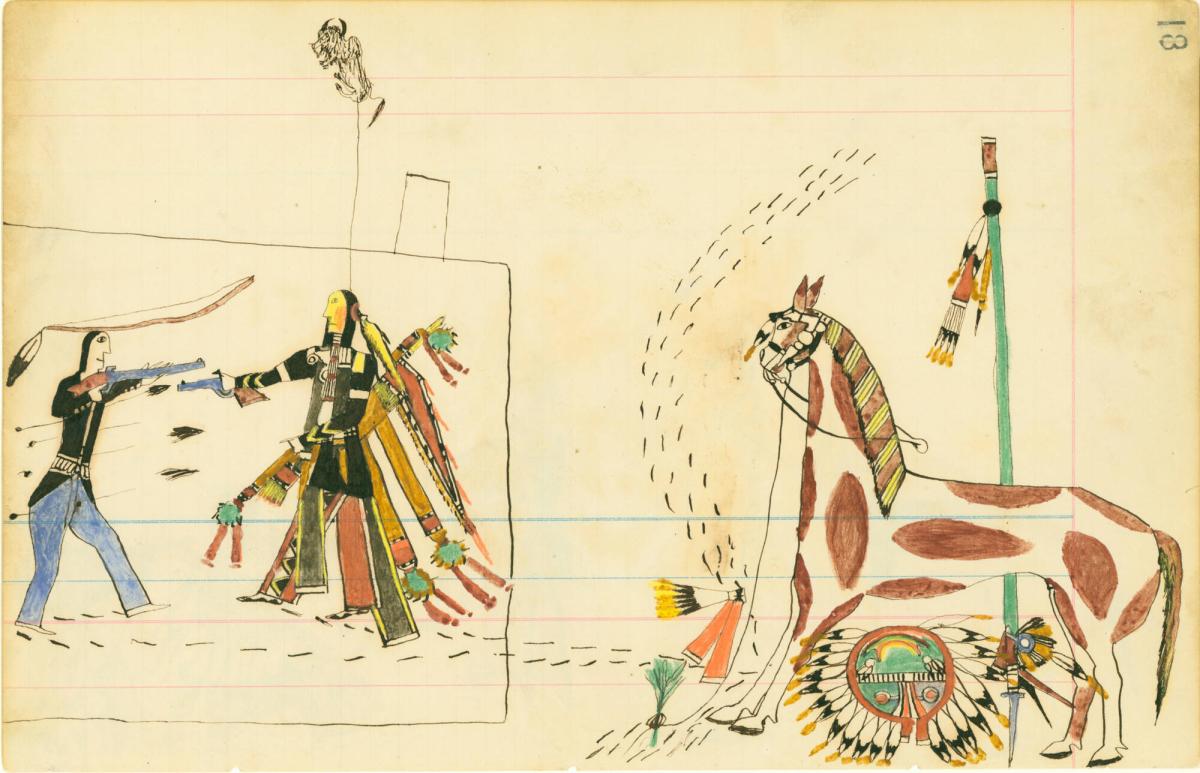 Howling Wolf’s ledger drawings—executed on ruled paper from account books used at western territory outposts—recount experiences before and after life on the reservation. Most depict warrior exploits and battles with U.S. government troops and local militia, though some of his most striking works illustrate Cheyenne ceremonies and hunting scenes. Howling Wolf’s participation in these events is indicated by the presence of his name pictogram above the scene. The majority of Howling Wolf’s drawings predate his imprisonment, although he was encouraged to continue his work while there. By 1878, Howling Wolf was released from prison and returned to the reservation, where he created at least twelve of the AMAM’s nearly thirty ledger sheets.