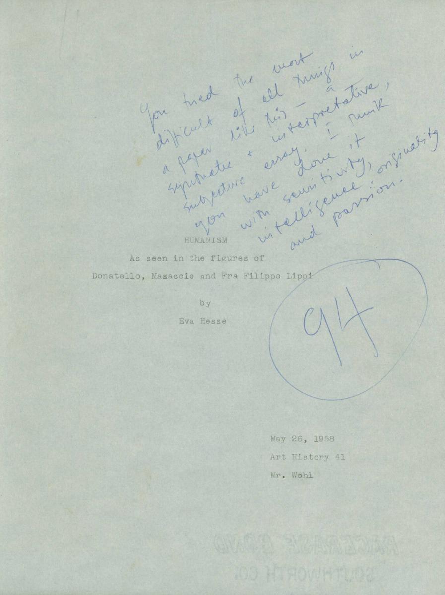 Hesse studied at the Art Students League, then at Cooper Union and Yale University, where she received her B.A. in 1959. Her many (abstract) drawings of around 1960-64 show her working with "the shapes...with which she had always been obsessed--irregular rectangles, parabolas, trailing linear ends, curving forms and circles bound or bulged out of symmetry."